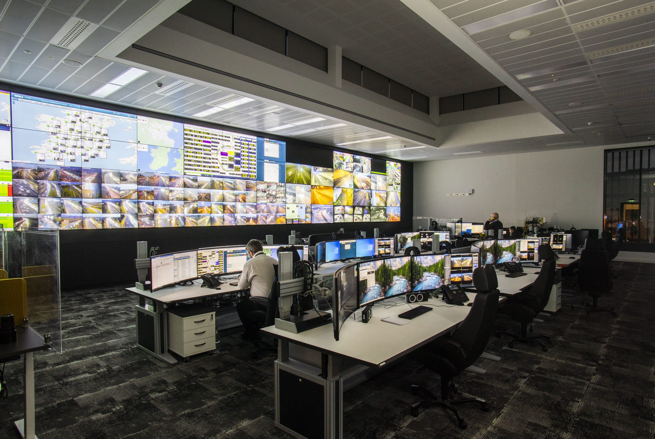 The control centre was constructed in 2020 as part of an upgrade and extension to the existing Dublin Tunnel Control Building. The main control room features a 3m-high, 15m-wide, 4.2-million-pixel video wall, which displays real-time feeds from the motorway CCTV camera network. It allows motorway and tunnel operators to spot developing incidents, enlarge views of incidents as they occur, and study CCTV images in detail before making decisions.
